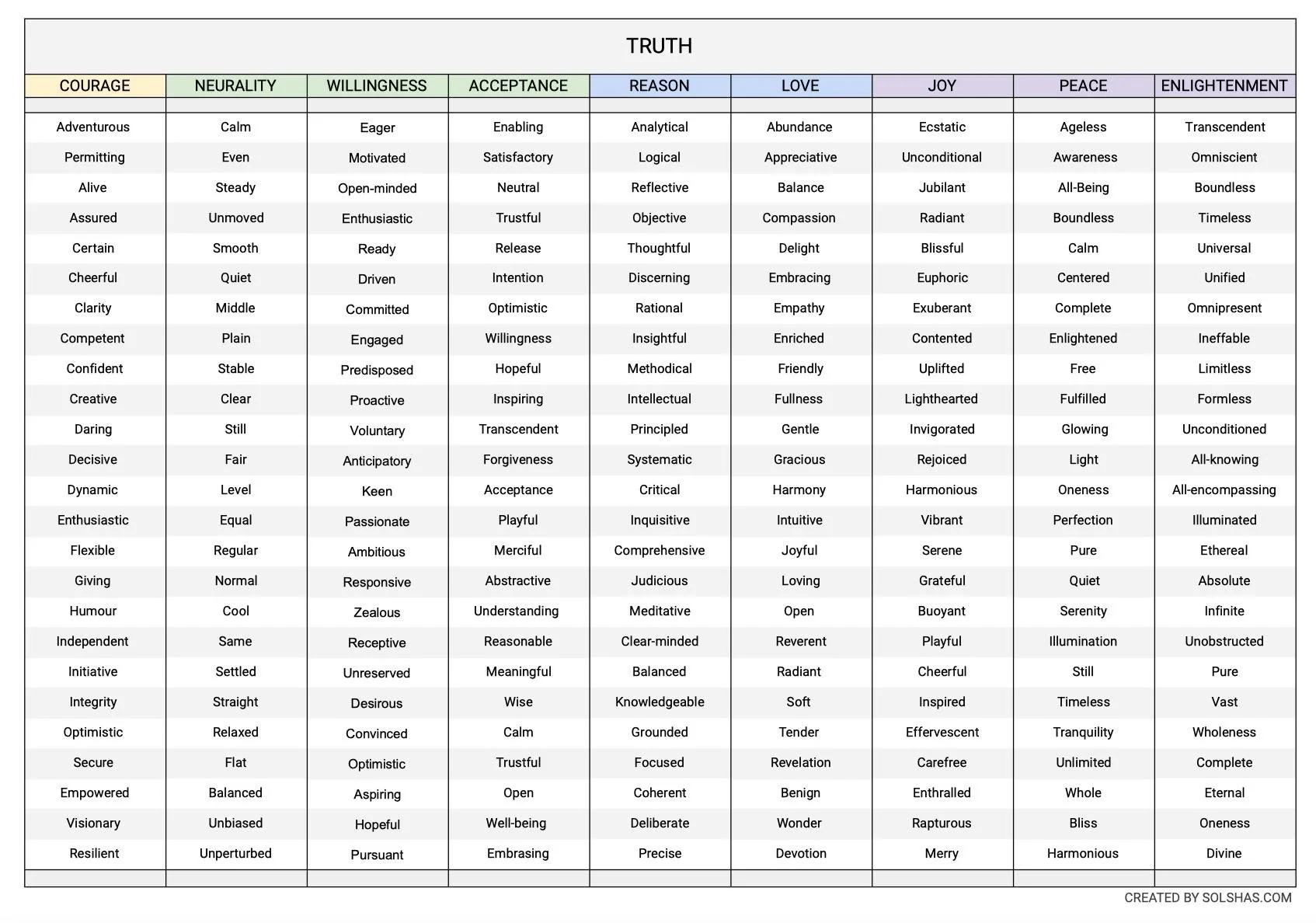 The Truthful emotional chart above are all of the emotions rates to the 4th, 5th, 6th & 7th dimensional levels of living and breathing in the Oneness, Unity, Singularity of the Heart. For the Heart only knows the Oneness of Life.