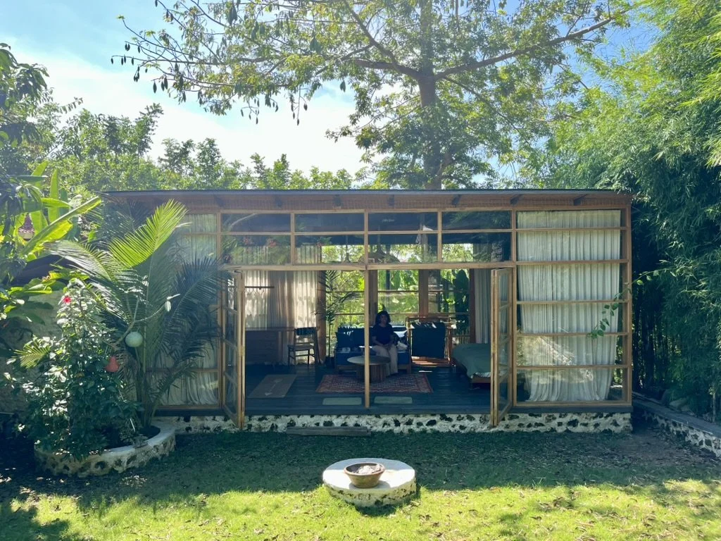 4 by 10 meters structure has an iron wooden floor and teak wooden window frames in Japanese architecture design. It’s all glass, but with the linen curtains can be completely closed off for more privacy.