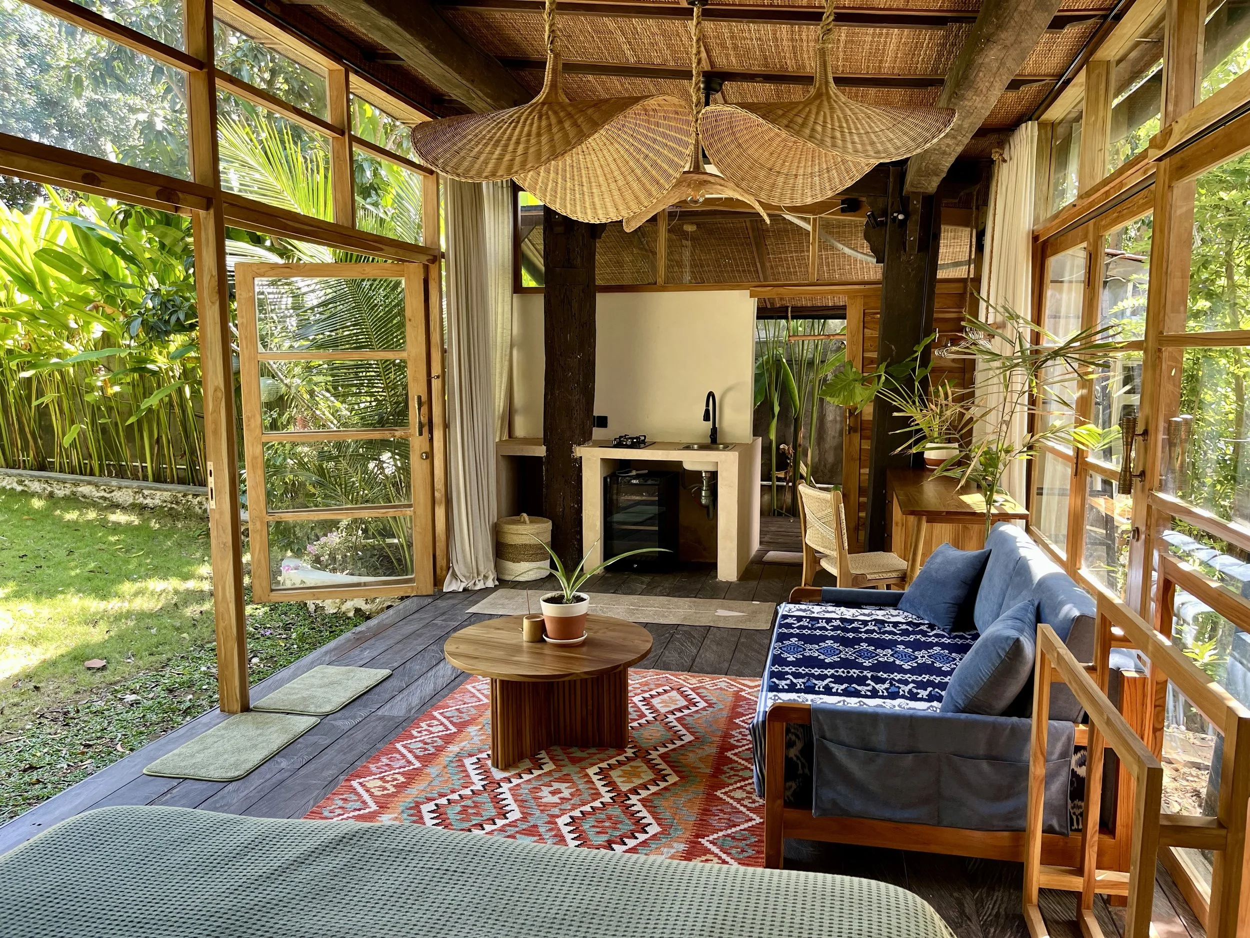 Large open living space with folding doors on the west facing side of the house. These folding doors can be closed during rainy season.