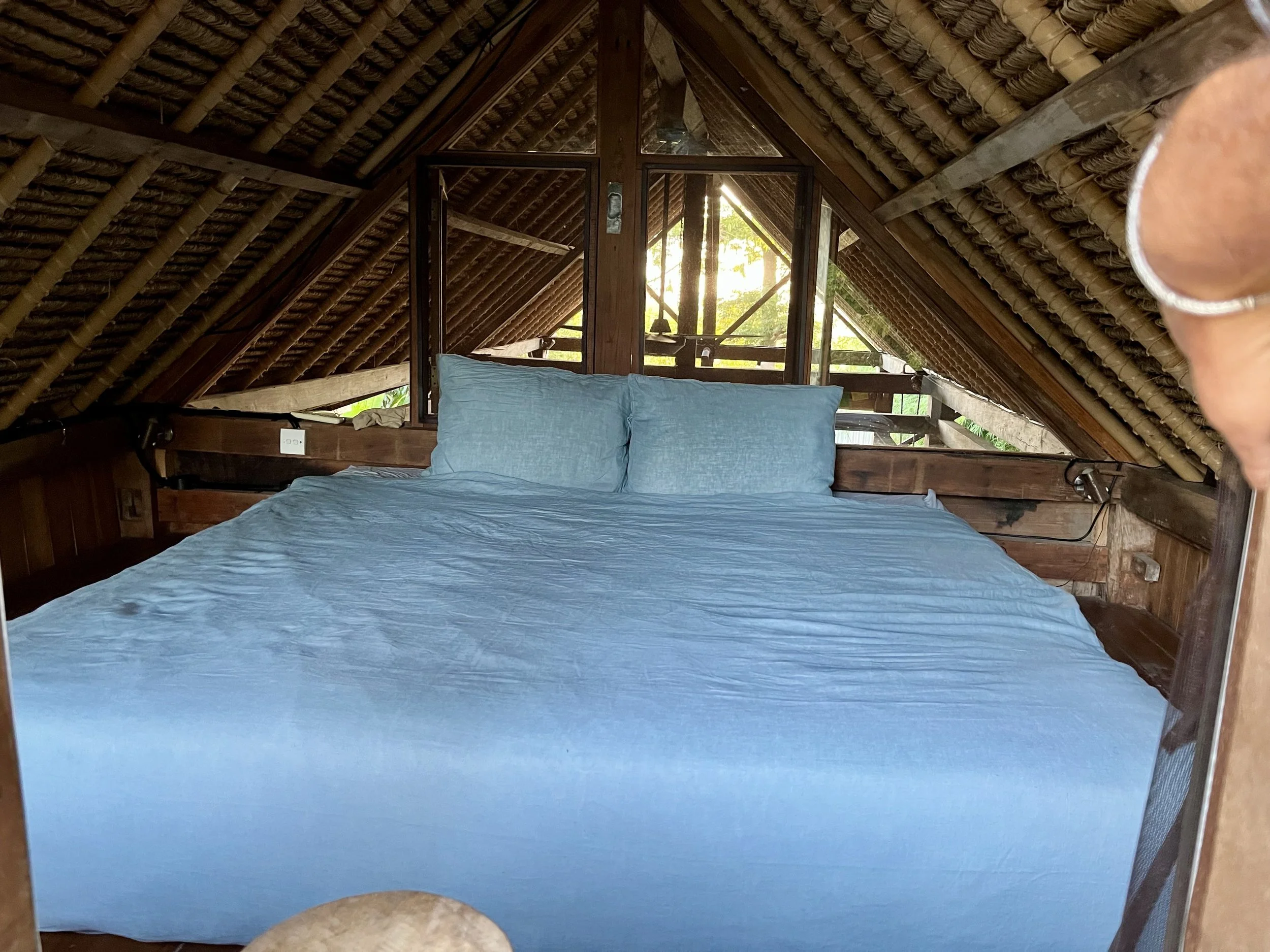 Upstairs loft bedroom, with super comfortable extra large kingsize 200cm by 200cm matras, natural cotton or linen bedsheets. The bedroom has mosquito frames in the windows which allows you to sleep with the windows open, for supernatural sleeping connected to nature, the best rests & sleep I have ever experienced. There is a fan and AC, I never use the AC, fan is more then enough for me.